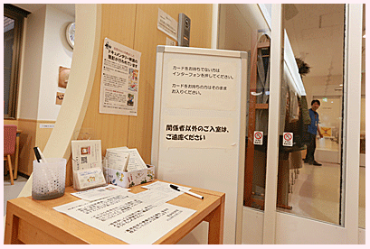 受付の用紙に必要事項を記入した後、白いセンサーにIDカードをかざすと、ドアが開きます。