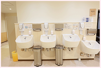 右端にこども用の背の低い手洗い場があります。きょうだいが一緒に面会するときにご利用ください。