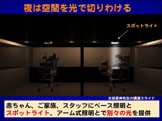 夜間は、ケアを行うときには光が周囲に漏れにくいスポットライトを使用し、隣の赤ちゃんや面会中の家族に影響が少ないようにしています。