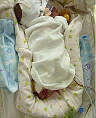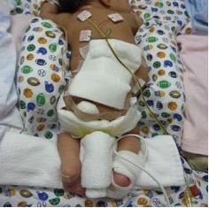赤ちゃんがここちよく過ごすために、また呼吸がなるべくしやすいように、赤ちゃんの手足やくび、あたまの位置を整えています。タオルやガーゼや専用のやわらかい枕をつかいます。